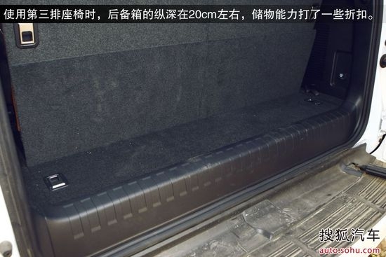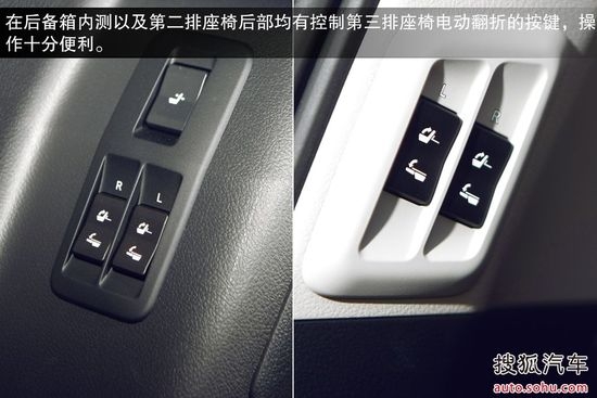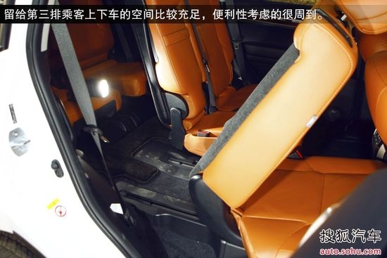 留給第三排乘客出入的空間尚可,乘客能夠以較為從容的姿勢上下車。第三排乘客腳下與腿部的空間并不富裕,頭部空間尚可。電動控制的第三排座椅很方便,但是仍只能做應急之用。
