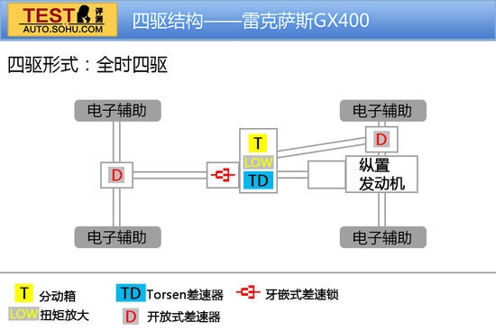 GX400的全時四驅系統采用采用由JTEKT提供的Torsen差速器,利用分動器實現動力分配,分動箱帶有鎖止功能。前后軸則通過電子輔助實現LSD的限滑功能。通常情況下系統采用前后40:60的扭力分配,獲得接近后驅車的敏捷操控。在轉向和輪胎打滑時,四驅系統都會積極的調整扭矩分配,以獲得最佳的牽引力。
