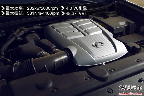 4.0L V6引擎為重達2350kg的雷克薩斯GX400提供動力來源,其最大功率202kw/5600rpm,最大扭矩達到381Nm/4400rpm。動力通過五速自動變速箱傳遞至帶有Torsen差速器的全時四驅系統。
