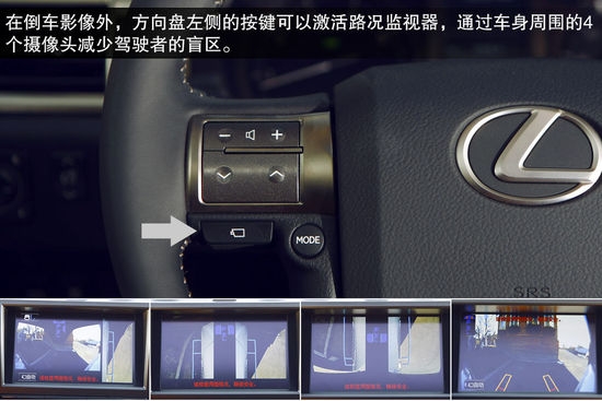除此之外,GX400的全方位多地形路況監視器,通過車身周圍分布的攝像頭,減少行車時的視線盲區。多個輔助攝像頭通過左手拇指位置的按鍵控制,使用起來很方便,提供的視點以及功能也非常豐富,幫助這個大家伙在野外以及狹窄的地方擁有更靈活的表現。遺憾的是雷克薩斯并沒有整合這些攝像頭進行全景模擬,頻繁切換攝像頭仍然有些不那么便利。