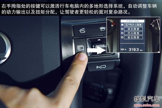 通過方向盤上右手拇指處的按鍵,可以使用GX400配備的多地形選擇系統。系統提供了四種路況模式,包括巖灘、泥沙、丘陵等,自動調整動力輸出、換擋時機以及扭矩分配,幫助車主更從容的在野外行駛。
