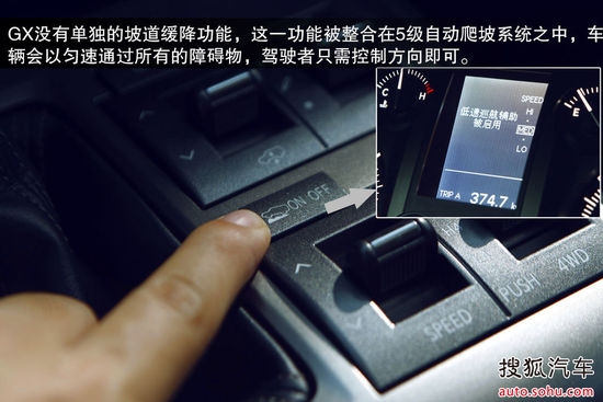 雷克薩斯GX400并沒有單獨的坡道緩降按鍵,而是將其整合在5速自動爬坡系統之中,這一系統能夠自動調整發動機輸出和制動系統協同工作,使車輛以勻速通過崎嶇路面,駕駛者只需要專注方向盤的操作即可。