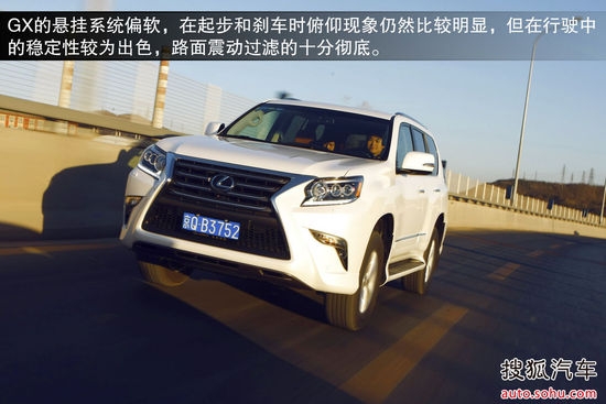 開著雷克薩斯GX400上路,在標準懸掛高度下,駕駛者的坐姿幾乎與大公共相同。因此在從大車旁邊經過時,壓力要比一般車型小很多。雖然采用非承載式車身設計,雷克薩斯GX400的舒適性沒有受到任何影響。空氣懸掛于KDSS電子動態懸架系統的配合,使其能夠在最大限度減少路面震動對車內乘客的影響的同時,避免高重心以及軟懸掛帶來的晃動感。急加速和減速時,仍然有明顯的點頭和抬頭現象。
