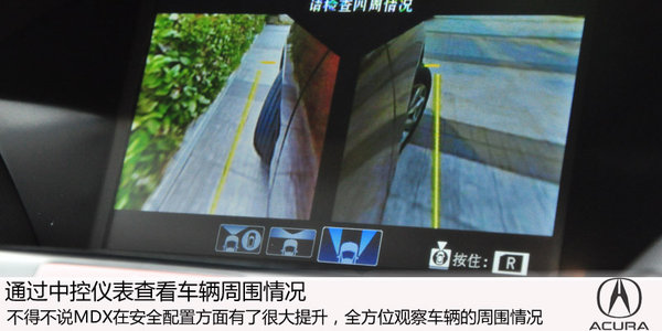 全新一代謳歌MDX為消費(fèi)者提供了全景攝像頭,只需輕觸按鈕即可提供6種取景:前方+地面取景、前方廣角取景、兩側(cè)取景、后方 + 地面取景、后方廣角取景、右側(cè)取景。按下全新攝像頭按鍵即可進(jìn)入全景攝像頭系統(tǒng)。多種景別能夠?yàn)轳{駛者在狹窄區(qū)域停車提供安全和便利。