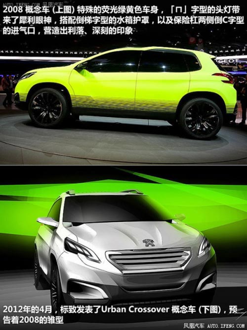 1007的推出并獲得好評,代表了消費者對標致跨界產品的認可,在2008年的巴黎車展中,標致展出了Prologue概念車,并在來年年初正式發布了3008,同年法蘭克福車展更追加了5008。2008的出現,要回溯到2012年北京車展所發表的Urban Crossover Concept,仔細觀察這款小型跨界SUV概念,清楚能看到新世代家族徽飾與設計語匯,相隔數個月后的2012年巴黎車展,Peugeot就展出了名為2008 Concept的概念車,相當亮麗搶眼的色彩以及高完成度,讓人更加期待2008的問世到來。