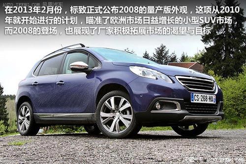 終于,在2013年2月下旬,標致汽車在日內瓦車展,搶先在開展前公布了2008。從概念車進展到量產版本的問世,標致以相當迅速的步調在短時間內完成,展現了標致對2008的重視,以及瞄準歐洲日益壯大之小型掀背、小型SUV市場的決心。事實上,標致內部早從2010年就已經展開研發計劃,這個名為2008 Project的計劃,在2010年9月份時,已經選定了外型設計,并在2011年7月份完成了所有設計,進入工程面向的階段。而如同外界所看到的,2012年4月份,標致先行推出Urban Crossover Concept,預示著2008的雛型,Crossover的車名也點出了跨界之初衷,相隔1個月后的2012年5月份,2008的原型車步入了完成階段。
