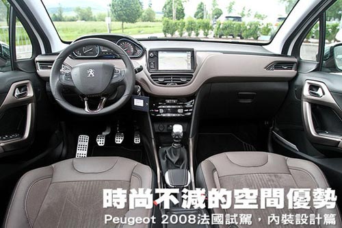 領取鑰匙并在工作人員引導下,前往機場地下室取車,進入車室后的第一個感覺,整體車室空間設計呼應著2008跨界之車格設定,視覺上的質感滿足時尚需求,而在諸多細節上的鋪陳,則融入了動感之渴望,而最重要的,就是整體配置相當簡約且好上手。還有另外一個令人備感熟悉的重要因素,2008除了是以208底盤為基礎之外,全車約莫有3分之2的零部件為共享,其車室空間陳設也理所當然的有著相同基調。