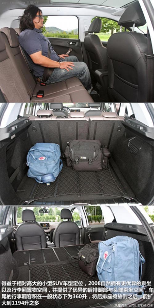 2008后排座椅椅面與車頂高度為876mm,椅面寬度則為468mm,提供后排乘員擁有相當不錯的座椅空間,而椅面與前座椅背的距離來到346mm,同樣提供不錯的腿部空間。車尾的行李廂容積在一般狀態下為360公升,將后排座椅翻折放平之后,能擴大到1194升之多。