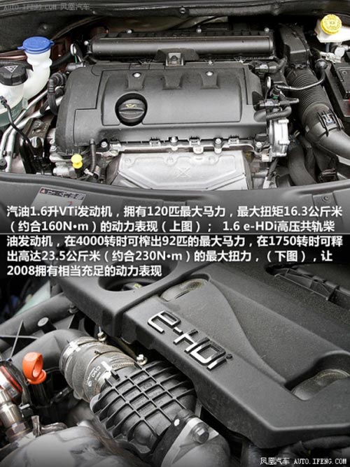 汽油引擎的1.6升VTi車型,擁有120匹最大馬力,以及最大扭力值16.3公斤米(約合160N?m)的動力表現,這具引擎與現行國內販賣的208 1.6 VTi所搭載之動力單元相同,在性能與效能表現上堪稱實用,但應付體形大上些許的2008,是否同樣能滿足樂趣需求,成為試駕過程的最大重點。