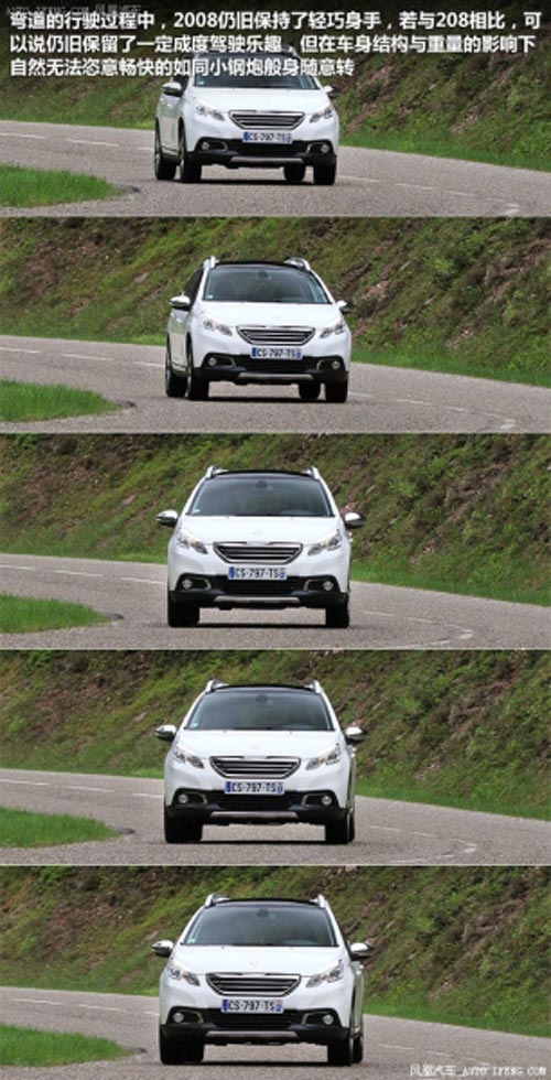下坡路段的表現則又略有不同,因為重量的影響,下坡路段彎到受到慣性影響,多少帶了點推頭的感覺,如同車輛前方下緣在進彎前,總有力量稍稍往前帶了一下,雖然不至于影響大局,但卻提醒駕駛人需要更謹慎的處理。有了慣性的另一項好處,就在于扭力傳輸不如上坡時略顯遲疑,通過彎頂點后,輕補油門后動力隨即向前驅馳2008,這時后的2008反而讓人與208之操駕表現有了最大連結。