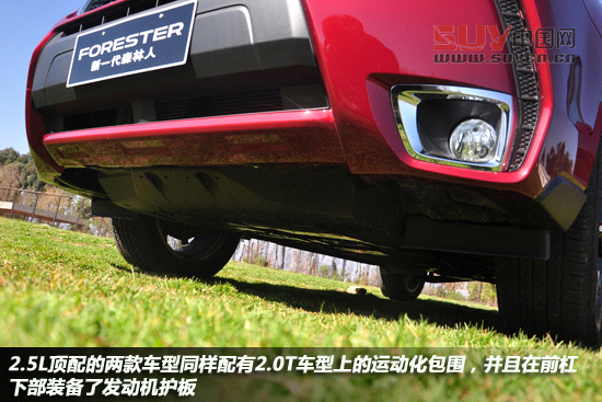 家族式的單橫條鍍鉻轉網狀進氣格柵可以在斯巴魯的其它車型中看到,2.5L高配車型與2.0T車型所配備黑色塑料包圍烘托出濃重的運動氣息,在前杠下方還裝有發動機護板。前臉獠牙裝的黑色“進氣口”是完全封死的,只起到裝飾作用,不能為制動盤起到散熱作用。