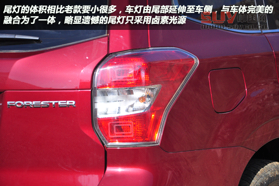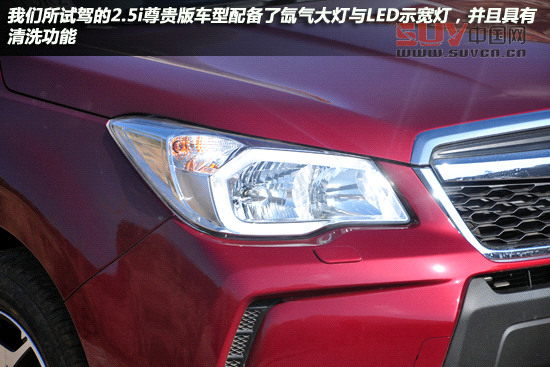 我們所試駕的2.5i尊貴版車型配備了氙氣大燈與帶狀的LED示寬燈,大燈具有清晰功能。上調的飛翼式大燈也是現在斯巴魯家族車型的特色,內部結構比較簡單,大燈不帶透鏡,據廠家透露將在以后的改款車型中增加這配置。