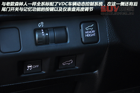 儀表盤的樣式非常樸素,白色背光的儀表帶有多級亮度可調,啟動時儀表會進行自檢。與老款森林人一樣全系標配了VDC車輛動態控制系統,在這一側還有后尾門開關與記憶功能的按鍵以及儀表盤亮度調節。另外中控臺頂部的配備了彩色顯示屏,不僅能夠提供倒車影像,還能顯示豐富的行車信息。