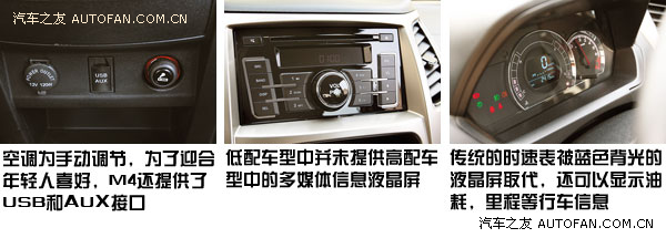 入門(mén)級(jí)車(chē)因?yàn)榭刂瞥杀镜脑颍蚨嗷蛏俚貢?huì)在內(nèi)飾材質(zhì)的選用和做工方面存在著不足。不過(guò)長(zhǎng)城汽車(chē)這些年來(lái)在內(nèi)飾方面進(jìn)行了提升和改善,雖然哈弗M4大部分的材質(zhì)依然以硬塑料為主,但是在做工和接縫方面有了很大進(jìn)步,當(dāng)然車(chē)內(nèi)的氣味還是讓我們?cè)谡麄€(gè)試駕過(guò)程中始終開(kāi)著車(chē)窗。哈弗M4對(duì)中控臺(tái)進(jìn)行了重新設(shè)計(jì),以純黑為主打,鍍鉻中控面板造型讓內(nèi)飾風(fēng)格更加粗獷。儀表板的設(shè)計(jì)加入了科技感覺(jué),傳統(tǒng)的時(shí)速表被藍(lán)色背光的液晶屏取代,還可以顯示油耗,里程等行車(chē)信息。M4的方向盤(pán)與長(zhǎng)城騰翼C30一樣,并且還是多功能方向盤(pán),盡管只配置了簡(jiǎn)單的幾個(gè)按鈕,但在這樣的價(jià)位上還是不多見(jiàn)的。我們?cè)囻{的車(chē)型是M4低配的兩驅(qū)舒適型,所以在配置方面不及高配車(chē)型豐富,比如被長(zhǎng)城稱為“MP5+GPS+倒車(chē)影像+倒車(chē)?yán)走_(dá)”多媒體組合的中控臺(tái)就只出現(xiàn)在高配車(chē)型中。不過(guò),像12V車(chē)載電源,USB和AUX外置音源接口,大燈高度可調(diào)等這些則是全系的標(biāo)配。
