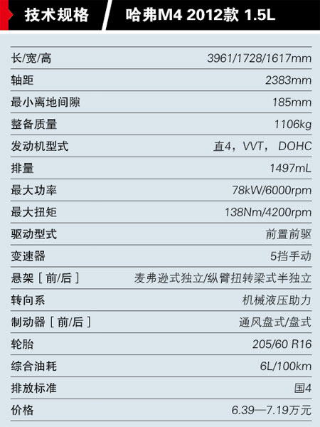 哈弗M4上搭載的這款1.5L 全鋁VVT 發(fā)動(dòng)機(jī)和與之匹配的5速手動(dòng)變速箱,這樣的搭配和數(shù)據(jù)我們并不陌生,因?yàn)樗霈F(xiàn)在眾多的長(zhǎng)城車(chē)型中,動(dòng)力表現(xiàn)與長(zhǎng)城C30、哈弗M2 基本類(lèi)似,其最大功率為78kW/6000rpm,最大扭矩為138Nm/4200rpm。由于M4離地間隙比較大,所以坐姿就比較高,這樣能獲得一個(gè)較為寬闊的高視野,SUV車(chē)型的優(yōu)越性也就體現(xiàn)出來(lái)。在整個(gè)駕駛過(guò)程中,發(fā)現(xiàn)離合器的離合點(diǎn)比較高,長(zhǎng)時(shí)間駕駛或者是堵車(chē)時(shí)候會(huì)比較疲憊。5擋手動(dòng)變速箱擋位比較清晰,整個(gè)換擋行程偏長(zhǎng),讓換擋過(guò)程并不是那么順暢,特別2擋換3擋時(shí),生澀感比較強(qiáng)。行車(chē)過(guò)程中,能感覺(jué)哈弗M4的動(dòng)力調(diào)校比較保守,油門(mén)響應(yīng)不夠積極。這可能是因?yàn)楣4的發(fā)動(dòng)機(jī)屬于高轉(zhuǎn)速發(fā)動(dòng)機(jī),功率和扭矩的爆發(fā)都在4000轉(zhuǎn)之后的緣故。所以如果保持2000轉(zhuǎn)左右換擋,哈弗M4的動(dòng)力表現(xiàn)一般,但若將轉(zhuǎn)速拉高,能夠明顯感覺(jué)到相對(duì)更充沛的動(dòng)力輸出,剎車(chē)有些偏軟。由于車(chē)身比較高,車(chē)身重心相應(yīng)較高,在高速行駛時(shí)會(huì)感覺(jué)重心不穩(wěn),車(chē)內(nèi)噪音也偏大,M4更適合在城市中行駛。得益于較高的離地間隙,M4的通過(guò)性相對(duì)要比轎車(chē)好很多。哈弗M4的底盤(pán)沿用了炫麗身上的前麥弗遜式獨(dú)立懸掛、后縱臂扭轉(zhuǎn)梁式復(fù)合懸掛的組合,調(diào)校得偏向于硬朗,過(guò)彎時(shí)車(chē)身的側(cè)向支撐不錯(cuò)。操控方面,方向盤(pán)的指向性和之前長(zhǎng)城其他車(chē)型差不多,手感偏重,路感還比較清晰。