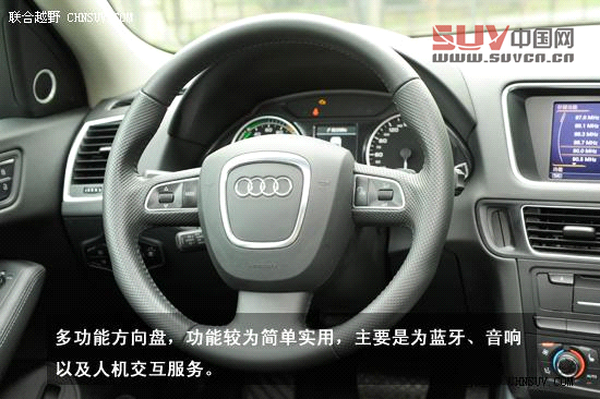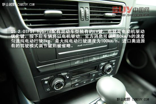 中控臺與其它進口奧迪Q5并無太大差別。但我們可以發現,在單碟DVD下方,Q5 2.0TFSI hybrid配有混動車型獨有的EV鍵,也就是電動機驅動優先鍵,按下后車輛將以電機驅動,官方消息可以用60km/h的速度勻速純電動行駛3km,最大純電動行駛速度為100km/h。進口奧迪原有的駕駛模式調節鍵則被省略。