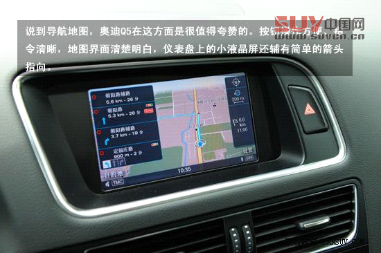 說到導航地圖,奧迪Q5在這方面是很值得夸贊的。按鈕操作方便、指令清晰,地圖界面清楚明白,儀表盤上的小液晶屏還輔有簡單的箭頭指向,小編我不由設想:如果這個導航真的能化身人形的話,那該是一位頭腦多么清晰冷靜的領隊啊!