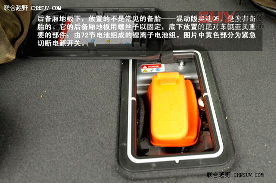 后備廂地板下,放置的不是常見的備胎——混動版奧迪Q5,是沒有備胎的。它的后備廂地板用螺絲予以固定,底下放置的是對車輛至關重要的部件:由72節電池組成的鋰離子電池組。圖片中黃色部分為緊急切斷電源開關。