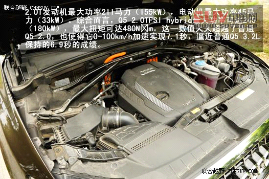 發動機:2.0T發動機最大功率211馬力(155kW),電動機最大功率45馬力(33kW)。綜合而言,Q5 2.0TFSI hybrid最大功率可達245(180kW),最大扭矩可達480N?m。這一數值大大超越了普通Q5 2.0,也使得它0-100km/h加速實現7.1秒,逼近普通Q5 3.2L保持的6.9秒的成績。