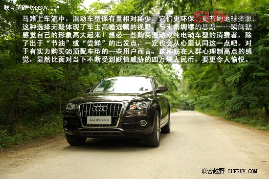 9、小編我開著一輛混動車型在路上走,經常會覺得自己與眾不同——盡管我開的是試駕車。馬路上車流中,混動車型保有量相對稀少,它們更環保、更節約地球資源,這種選擇無疑體現了車主高瞻遠矚的視野,與未雨綢繆的思路——瞬間就感覺自己的形象高大起來!想必一些購買混動或純電動車型的消費者,除了出于“節油”或“嘗鮮”的出發點,一定也會從心里認同這一點吧。對于有實力購買Q5頂配車型的一些用戶而言,這種站在人群心理制高點的感覺,顯然比面對當下不斷受到貶值威脅的四萬塊人民幣,要更令人愉悅。