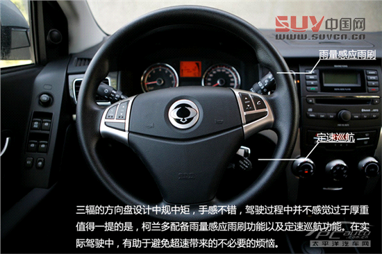 三輻的方向盤設計中規中矩,手感不錯,駕駛過程中并不感覺過于厚重,值得一提的是,柯蘭多配備雨量感應雨刷功能以及定速巡航功能。在實際駕駛中,有助于避免超速帶來的不必要的煩惱。