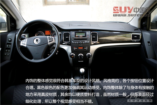 內飾的整體感覺很符合韓系車型的設計風格。設計風格簡約,各個按鈕位置設計合理。黑色銀色的配色更加強調其運動感受。內飾整體除了與身體有接觸的地方采用真皮材質,其余均以硬質塑料打造,雖然材質一般,但是表面經過細化處理,所以整個視覺感受相當不錯。