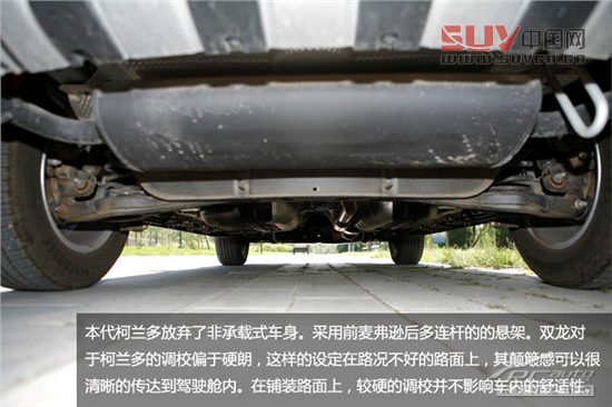 作為定位為城市型SUV的柯蘭多,本代柯蘭多放棄了非承載式車身。采用前麥弗遜后多連桿的的懸架。雙龍對于柯蘭多的調校偏于硬朗,路面上的顛簸感可以很清晰的傳達到駕駛艙內。