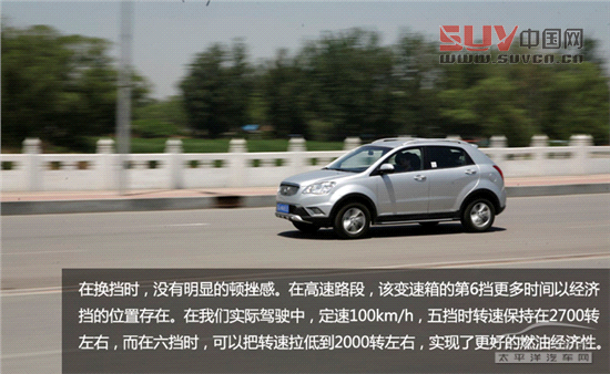 在變速器上,柯蘭多全系配備6速變速箱。這樣的配備在同級別車型中屬于主流配置。本次試駕的為手動車型。在換擋時,沒有明顯的頓挫感。事實上,在高速路段,該變速箱的第6擋更多時間以經濟擋的位置存在。在我們實際駕駛中,定速100km/h,五擋時轉速保持在2700轉左右,而在六檔時,可以把轉速拉低到2000轉左右,實現了更好的燃油經濟性。