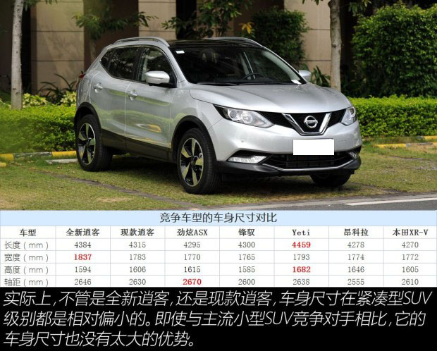 全新逍客雖然定位在緊湊型SUV級別,但是它的車身尺寸在緊湊型SUV中屬于較小的一類,而且和主流小型SUV相比也沒有大多少。