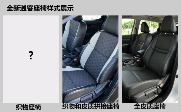 全新逍客一共提供三種座椅,分別是織物座椅、皮革和織物混搭座椅以及皮質座椅,不過我們目前還沒有采集到織物座椅的圖片。