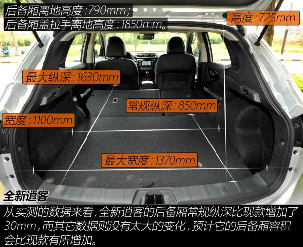 雖然身為緊湊型SUV,但受制于車身尺寸,全新逍客在乘坐空間上沒有特別突出的表現。不過它的后備廂的空間表現倒是挺令人滿意。