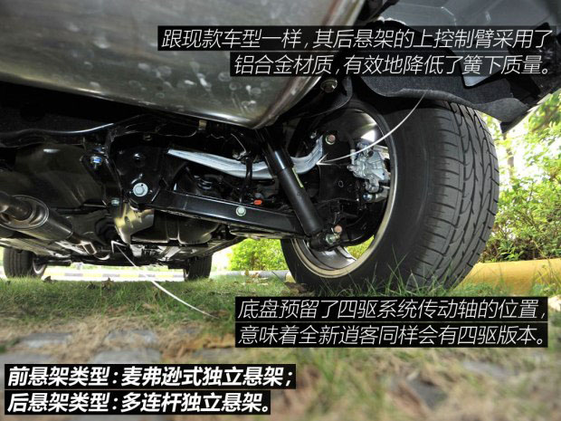 全新逍客搭載的是和現款奇駿2.0L車型一樣的MR20dd 2.0L自然吸氣發動機發動機,匹配CVT變速箱。至于1.2T車型,則會在明年初才上市。值得一提的是,在歐洲,全新逍客的后懸架已經改為扭力梁式非獨立懸架,而在中國市場銷售的車型則仍保留了多連桿獨立后懸架。