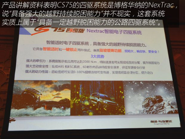 相較于外觀內飾和配置的不同,四驅版的潛在消費者更關心的自然是搭載四驅系統后的整車駕乘性能。不出意料,CS75的四驅系統是博格華納的NexTrac,這套系統在哈弗H6等主流中國品牌SUV以及幾款韓系SUV中均有配備,算是一套成熟的系統,只不過CS75四驅版增加了四驅鎖止模式,可以在需要時通過鎖緊多片離合式的中央差速器來接通四驅系統。