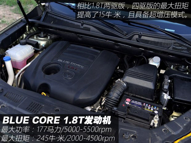 動力總成方面,四驅版目前只提供Blue Core 1.8T發動機和愛信6速自動變速箱的組合。不過這套動力總成在各方面都與兩驅版有所不同:首先發動機的扭矩提升了15?!っ祝_到245?!っ?2000-4500rpm,且發動機在油門踩到底時,具備10秒鐘的“超增壓模式”,扭矩最高能達到260?!っ祝氡剡@樣的調整也是為了應對四驅車型對動力更高的要求。
