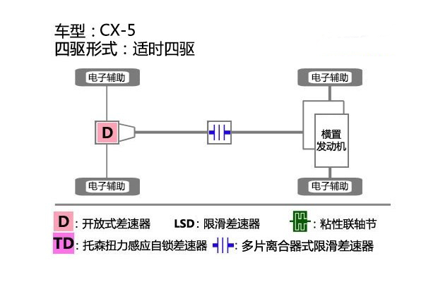 然后請出我們今天的主角——長安馬自達(dá)CX-5,分配到我們手上的是CX-5 2015款 2.5L 自動四驅(qū)旗艦型(以下簡稱CX-5),也就是全系的頂配車型。2.5L自然吸氣發(fā)動機+6AT的動力總成我們已經(jīng)很熟悉了,而它搭載的i-ACTIV AWD四驅(qū)系統(tǒng)是我們今天體驗的重點。從結(jié)構(gòu)來看,這套四驅(qū)系統(tǒng)和這個價位大部分城市SUV很類似,但是它的電控部分和動力分配邏輯有著自己的特點。