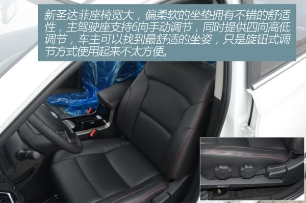 新圣達菲座椅寬大,偏柔軟的坐墊擁有不錯的舒適性,主駕駛座支持6向手動調節(jié),同時提供四向高低調節(jié),車主可以找到最舒適的坐姿,只是旋鈕式調節(jié)方式使用起來不太方便。