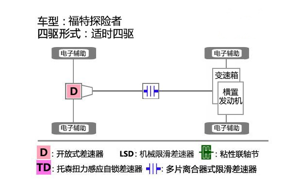 第五代探險者拋棄了之前的非承載式車身,采用了承載式車身結構,用來提升更多的公路駕駛能力,搭載的適時四驅系統和我們一般常見的城市SUV一樣,中央差速機構為多片離合器式限滑差速器,后橋輪間為開放式差速器,前后橋左右輪間的限滑功能均依靠電子輔助。探險者上的這套四驅系統不是為越野而生,是為了為提升公路性能而存在的。