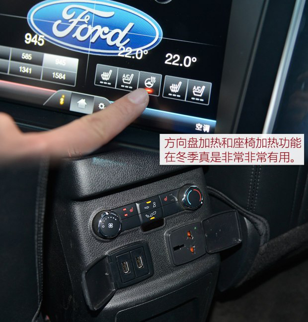 我們試駕的地點氣溫在零下十幾度,在外面呆一會就感覺身體要被凍透了,所有人上車后的第一件事就是打開座椅加熱功能,我們試駕的這款運動版車型前后排都配有此功能,座椅加熱開啟后很快就能感覺到暖意,還是非常給力的,另外探險者的后排提供了兩個USB充電口和一個電源插口,一下解決了冬季電子設備電池衰退的問題,我想很多朋友都遇到過天氣太冷手機剛拿出來就沒電了,探險者上多個充電口能讓乘客的電子設備都恢復活力,后排的電源插座也能給相機充電,這個一定要給好評。