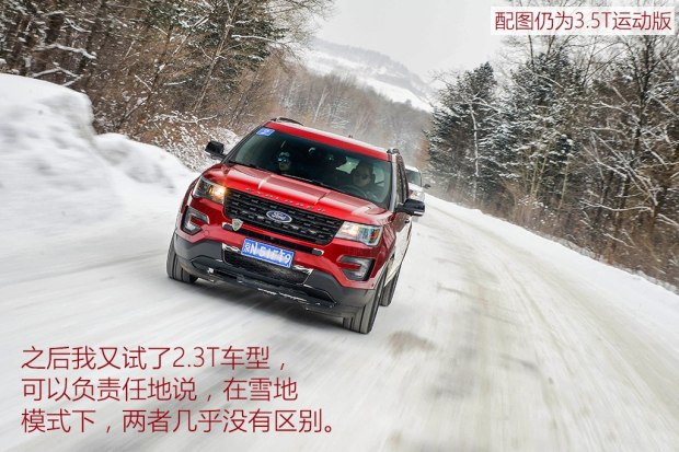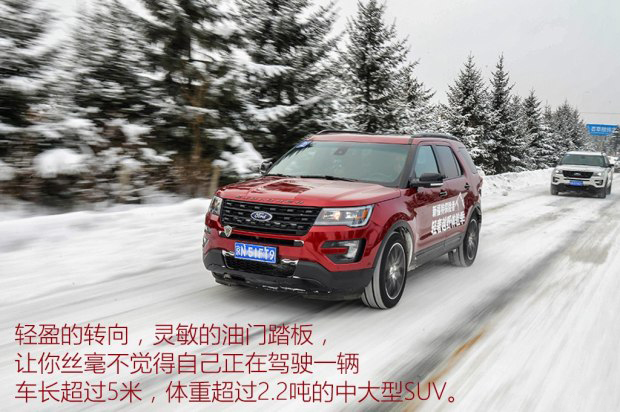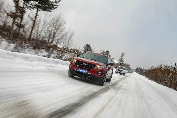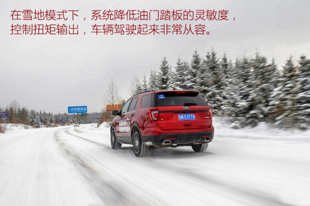 不過靈敏的油門踏板對于冰雪路面的駕駛并不是什么好事,因為路面的附著力低,稍微控制不好力度車身穩定系統就會強制介入,好在探險者配備了“路況實時管理系統”。