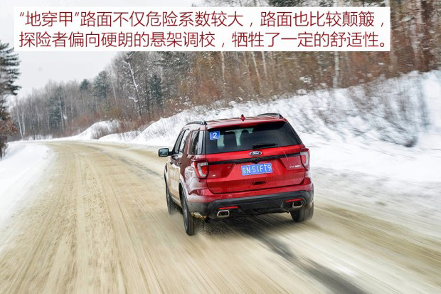 看似平整的路面底下都暗藏著冰塊,路面還是比較顛簸的,探險者的懸架則把多數顛簸產生的振動傳遞到了車內,它的懸架并不像我們固有印象中美系車那么柔軟舒適,偏向硬朗的調校是為了提升車身的平穩性和減小彎道中的側傾,但確實犧牲了一定的舒適性。