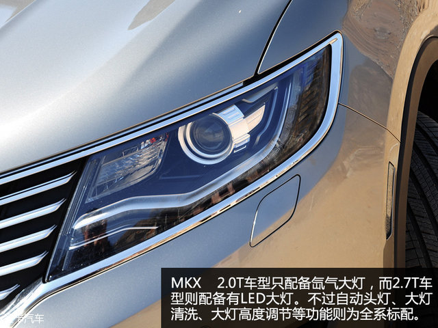 MKX 2.0T車型只配備氙氣大燈,而2.7T車型則配備有LED大燈。不過自動頭燈、大燈清洗、大燈高度調節等功能則為全系標配。