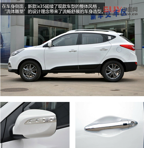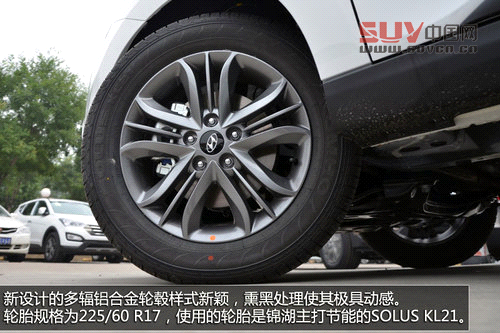 在車身側面,新款ix35延續了現款車型的整體風格,“流體雕塑”的設計理念帶來了流暢舒展的車身造型。輪轂的變化是此次改款的一大亮點,新樣式的多輻鋁合金輪轂經過了熏黑處理,視覺上顯得極具動感。據悉,新款ix35還可提供多款輪轂樣式,相信能夠滿足消費者的多樣需求。
