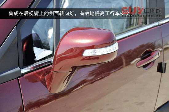 車身側面的輪廓依舊是圓潤憨厚的風格,輪眉和車門上的防擦護板,車身側面踏板,車頂的行李架等等都有著濃濃的跨界風。集成在后視鏡上的側面轉向燈,有效地提高了行車安全。雙五幅的黑底亮面運動風格視覺效果出色。 車頂行李架可以滿足車主戶外旅行的需求,同時還可以起到美觀的效果。