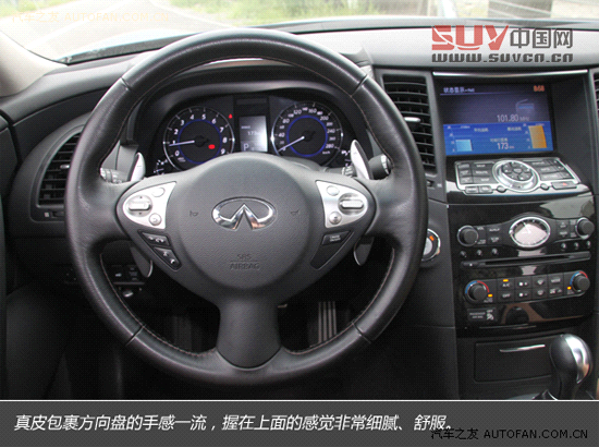 落座于駕駛席,面前這只小巧的方向盤似乎是直接從G37 Coupe上直接拿過來的,別說是大型SUV,就在轎車上,這種尺寸的方向盤都只出現在少數特別專注于駕駛樂趣的車型。