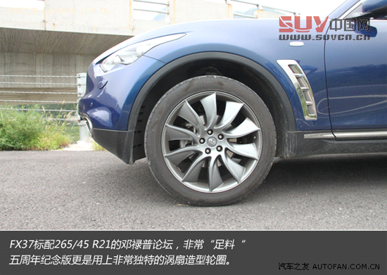 盡管如此,就單從輪轂而言,這也絕對算得上FX史上最漂亮的輪轂了。FX37標配265/45 R21規格的鄧祿普輪胎,就規格而言在這個價位區間難尋對手。碩大的輪圈看來非常夸張,不過這恰好體現了跑車化SUV的概念,所以FX跑起來顯得虎虎生風,這四只大腳也為其霸氣的“氣場”加分不少。
