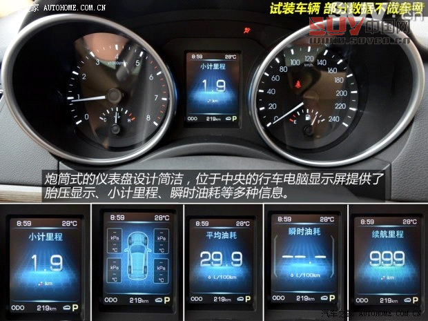 點火后的儀表盤是我們之前不曾見過的,炮筒式的造型搭配白色的背光簡潔明朗,位于中央的彩色行車電腦顯示屏可提供胎壓、瞬時油耗以及小計里程等信息,并且所顯示數據均可呈現出一定的立體效果,視覺效果令人滿意。