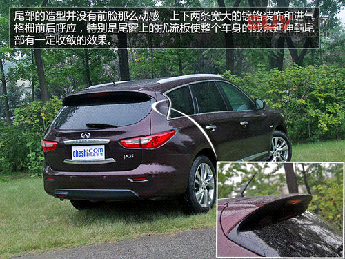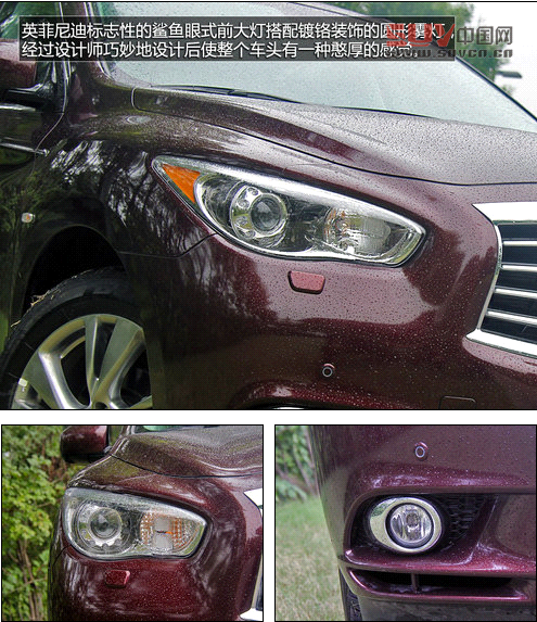 英菲尼迪JX35的長寬高分別為4997mm*1960mm*1750mm,軸距為2900mm,如此龐大的體積保證了內部的乘用空間。英菲尼迪JX35夸張的進氣格柵并沒有像FX前臉那樣的兇猛,大面積的鍍鉻裝飾帶來清晰地線條感,使整個前臉看上去柔美了許多。梯形的下格柵設計的相對要收斂很多。英菲尼迪標志性的鯊魚眼式前大燈搭配鍍鉻裝飾的圓形霧燈,經過設計師巧妙地設計后使整個車頭有一種憨厚的感覺。