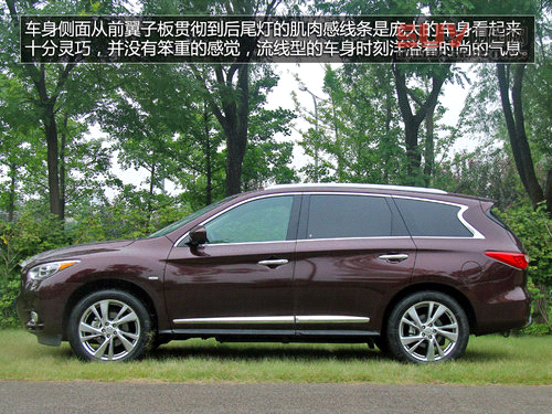車身側面從前翼子板貫徹到后尾燈的肌肉感線條是龐大的車身看起來十分靈巧,并沒有笨重的感覺,流線型的車身時刻洋溢著時尚的氣息。新月形的D柱設計是側面的一大亮點,優美的造型搭配寬大的第三排車窗,營造豪華感絕對是英菲尼迪的拿手好戲。寬大的鍍鉻門把手配上無鑰匙進入功能使開關車門變得十分便捷。
