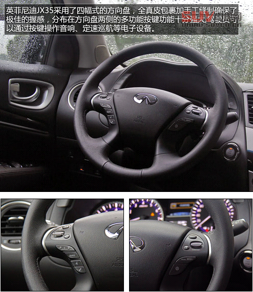 榮膺Wards Auto“2012年度十佳內飾”大獎的全新英菲尼迪JX內飾極具奢華,真皮加上楓木裝飾板使整個駕駛艙充滿豪華感的同時兼具了居家的風格。空調和音響按鍵被統一整合到中控臺的中央,略微突起的設計使駕駛員更易操作。英菲尼迪JX35采用了四幅式的方向盤,全真皮包裹加手工縫制確保了極佳的握感,分布在方向盤兩側的多功能按鍵功能十分強大,駕駛員可以通過按鍵操作音響、定速巡航等電子設備。