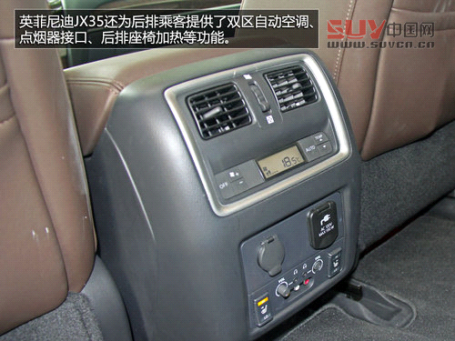 中控臺的左下方為功能區,分別設有舍身穩定系統、電動后備箱開關、英菲尼迪安全屏障系統等按鍵。英菲尼迪JX35還為后排乘客提供了雙區自動空調、點煙器接口、后排座椅加熱等功能。120V的電源配備為長途旅行增添了很大的便利性。